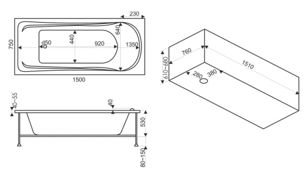 Прямоугольная акриловая ванна BAS Бриз 150х75 см - Характеристики