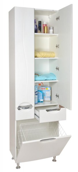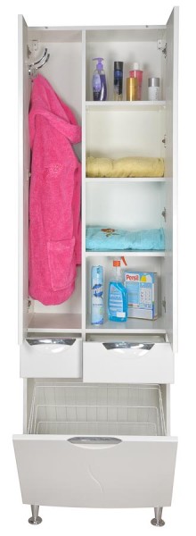 Его ширина составляет всего 60 см, поэтому пенал не займет много места в помещении. Наличие бельевой корзины дарит дополнительный комфорт. Пенал имеет достаточно ящиков и отделений для хранения всех необходимых ванных принадлежностей.