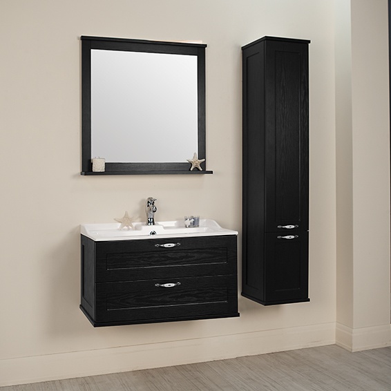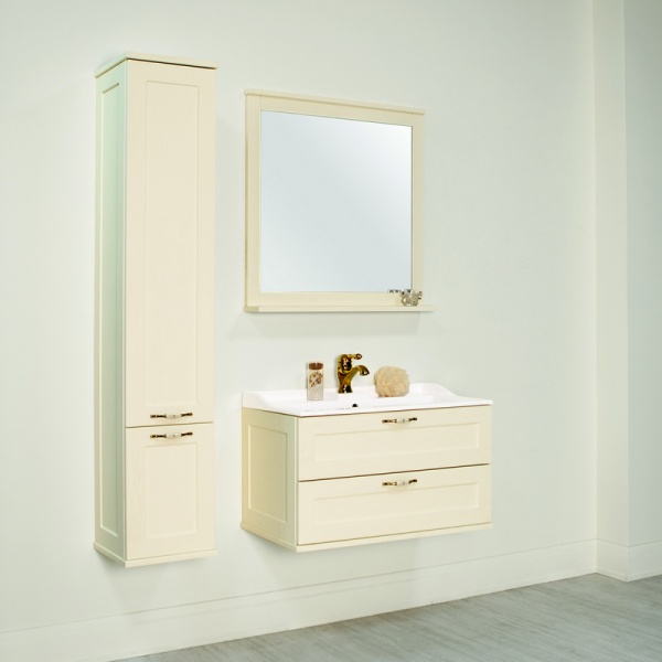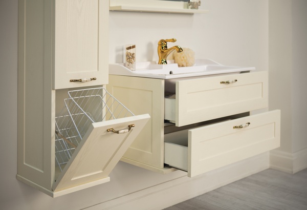 В тумбе установлены два ящика для хранения ванных принадлежностей. Кроме того, на изящной полочке зеркала можно разместить мелочи, которые всегда должны быть под рукой. В нижней части колонны установлена бельевая корзина, а в верхней – полки для полотенец и белья.