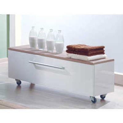 Выкатная тумба оснащена прочными колесиками, внутри есть все необходимое для хранения ванных принадлежностей. Изготовлена из натуральных древесных материалов и имеет специальное влагостойкое покрытие, которое обеспечивает устойчивость ко влажному микроклимату ванной.