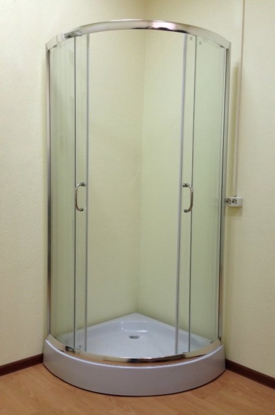 Душевой уголок AM-A-025-90 формой четверти круга с прозрачными стеклами и раздвижными дверьми.