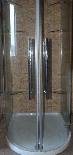 Предусмотрено трехстенное ограждение, а сама конструкция – полукруглая. Используется невысокий поддон и удобные распашные дверцы. В производстве используется закаленное стекло, которое радует не только своим изящным блеском, но и рекордной прочностью.