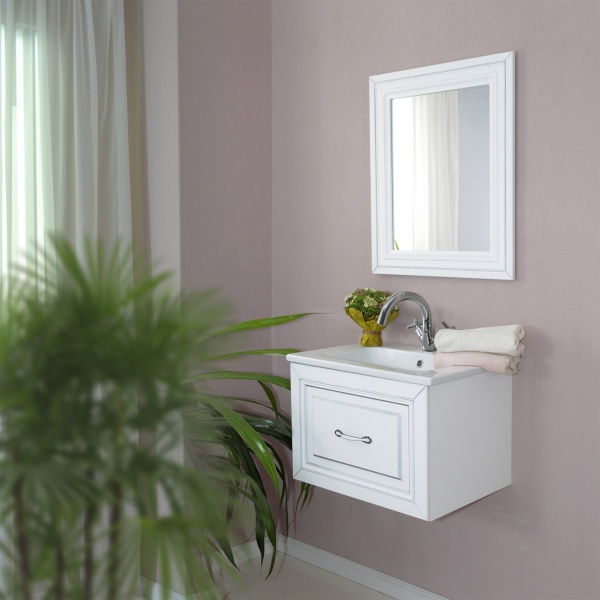 Набор мебели Валери 260 (белый матовый серебро) с подвесной тумбой, раковиной Euphoria 60 и прямоугольным зеркалом.