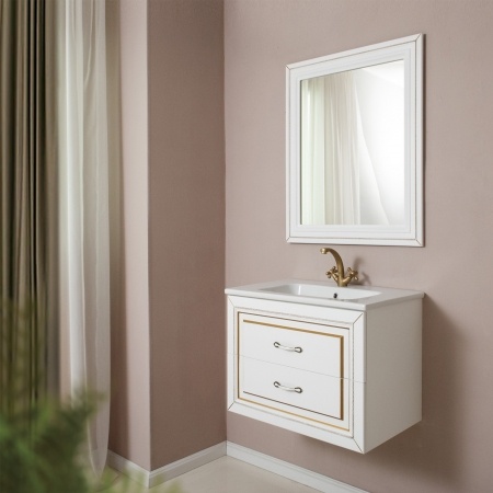 Набор мебели Валери 280 (белый матовый золото) с подвесной тумбой, керамической раковиной Euphoria 80 и прямоугольным зеркалом в раме.