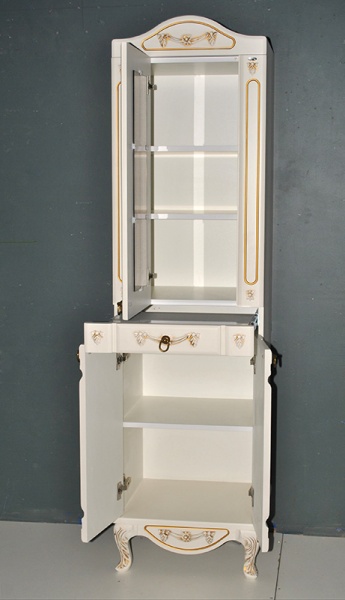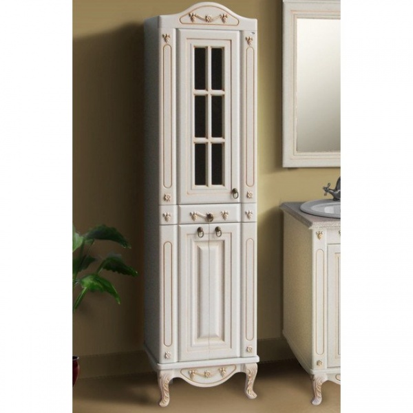 Декоративные элементы и легкая фрезеровка фасада подчеркнуты золотой патиной, что делает атмосферу в ванной комнате более нежной и теплой. Мебельные ножки, ручки и тонированные стекла вписываются в цветовую гамму изделия, подчеркивают изящность и нарядность классического стиля.