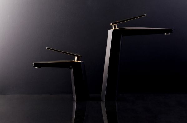 Смеситель для умывальника 382-B (черный+золото) однорычажного типа управления черного цвета с золотым декором.