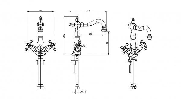 Он выполнен в классическим стиле и предусматривает двухвентильную конструкцию. Регулировать напор и температуру воды вы можете с помощью двух кранов – для горячей и холодной воды. Излив достаточно удобен, чтобы мыть руки и умываться.