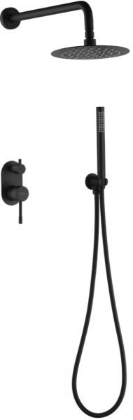 Душевой комплект Uno 464-B из латуни черный состоит из настенного держателя, смесителя, тропического душа.