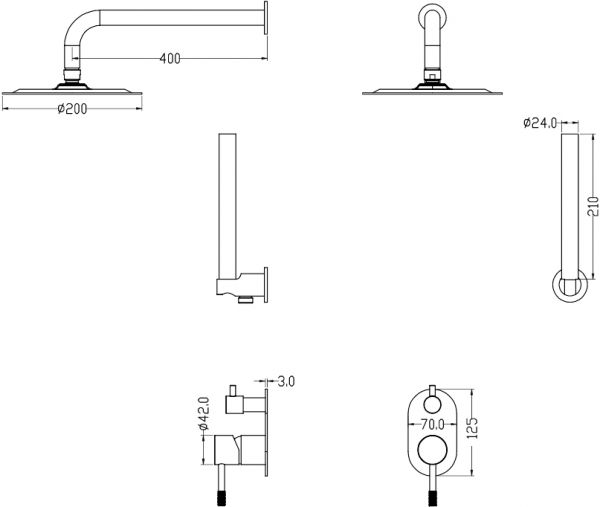 | Состав комплекта: | настенный держатель / смеситель / верхний душ / душевой гарнитур |