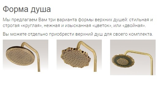 Оптимально подходит как: | бронза, со смесителем, с изливом, с лейкой, с тропическим (верхним) душем |