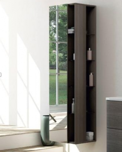 Колонна подвесная с открытыми полками и одной распашной дверцей, реверсная. Мебель предназначена для использования в ванных комнатах с повышенной влажностью.