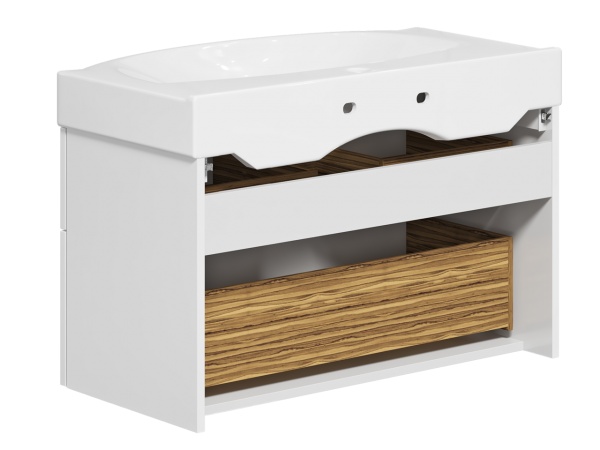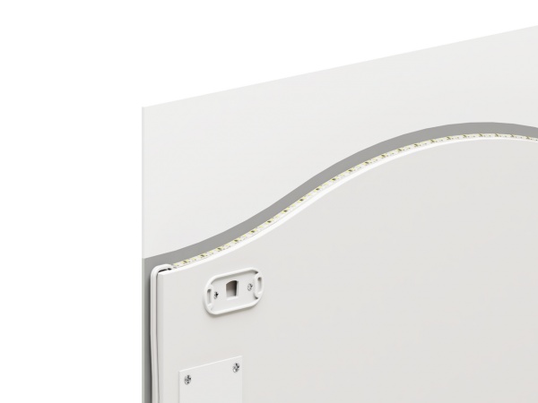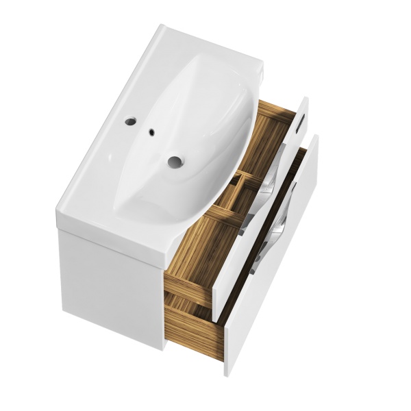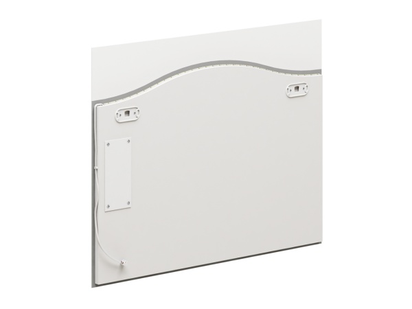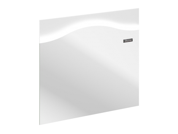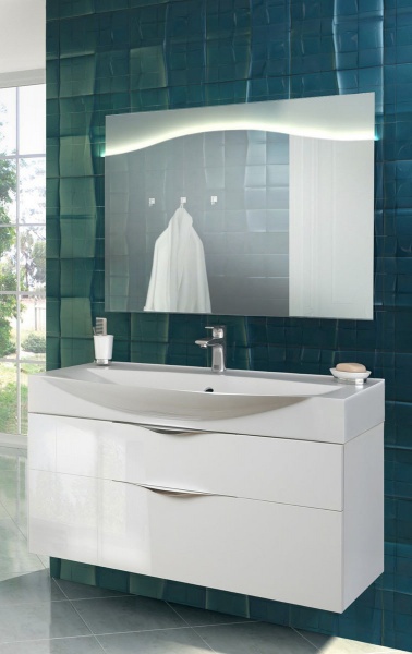 Набор мебели Дольче 85 белого цвета состоит из подвесной тумбы, керамической раковины, зеркала с верхней LED-подсветкой и выключателем. Пескоструйный рисунок в форме волны в верхней части зеркала.