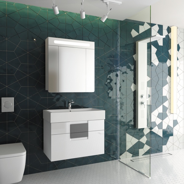 Комплект мебели Гласс 80 белый глянец включает в себя подвесную тумбу с выдвижными ящиками, керамический умывальник, зеркало-шкаф с встроенной подсветкой.