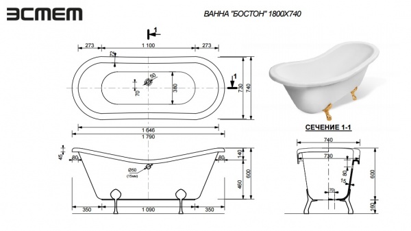 Фигурная мраморная ванна Эстет Бостон - Характеристики