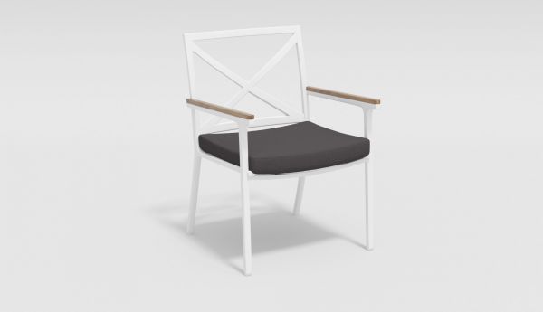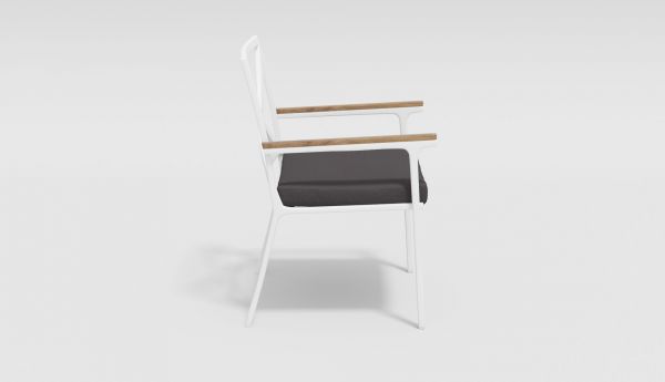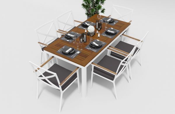 | Материалы и цвета: | каркас мебели выполнен из всесезонного алюминия с порошковым покрытием белого цвета, подлокотники стульев декорированы вставками из тика, подушки сидений обшиты уличной тканью темно-серого цвета (А13805) с водоотталкивающей пропиткой, толщина подушек 5 см, столешница обеденного стола изготовлена из тика |