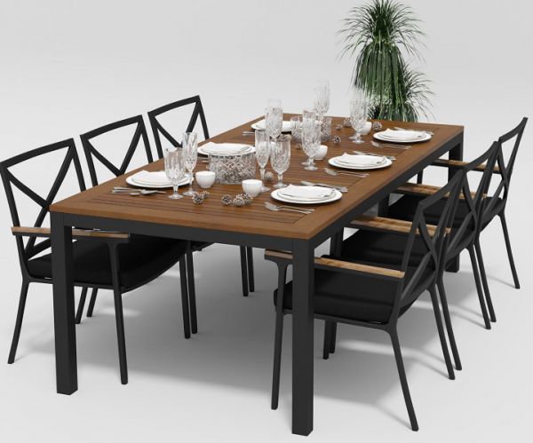 Каркас мебели выполнен из всесезонного алюминия с порошковым покрытием темно-серого цвета (карбон), подлокотники стульев декорированы вставками из тика, подушки сидений обшиты уличной тканью черного цвета (А13814) с водоотталкивающей пропиткой, толщина подушек 5 см, столешница обеденного стола изготовлена из тика.