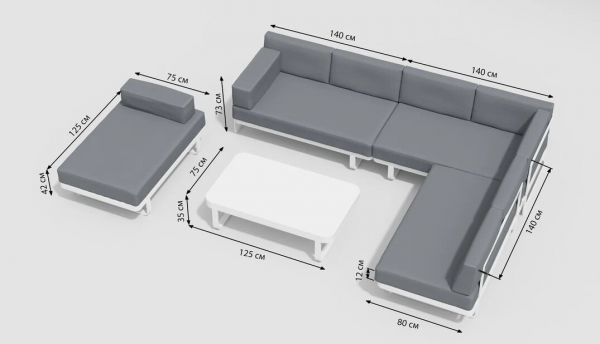 | Диван центральный: | 140 см х 80 см х 73 см |