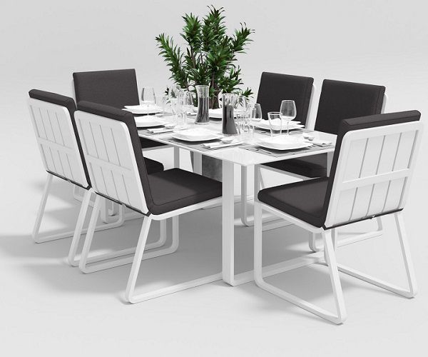 Каркас мебели выполнен из всесезонного алюминия с порошковым покрытием белого цвета. Подушки спинок и сидений стульев обшиты уличной тканью темно-серого цвета (А13805) с водоотталкивающей пропиткой, толщина подушек 5 см, чехол съемный на "молнии". Столешница обеденного стола глянцевая, изготовлена из закаленного стекла толщиной 5 мм, с нанесением белого цвета с помощью шелкотрафаретной печати.