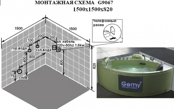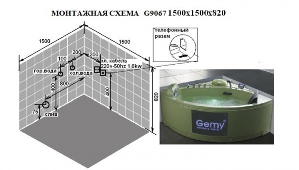 Угловая ванна из акрила станет излюбленным местом отдыха после рабочего дня. Модель традиционно оборудована массажными, озонирующими и световыми системами. Комплектация Gemy G 9067 O (150х150 см) включает холодильник, телевизор, FM-приемник и телефон, функцию контроля перелива, пульты дистанционного и электронного управления. Базовый цвет модели — белый, по заказу изготавливается ванна из зеленого акрила.