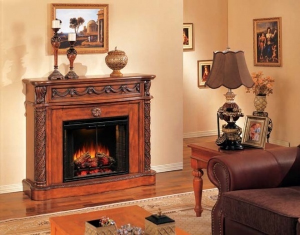 Каминное обрамление электрического комплекта выполнено в классическом стиле из шпонированого ценными пародами МДФ высокого качества. Модель может использоваться в качетве дополнительного обогрева помещения.