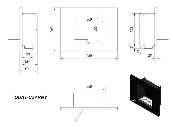 Quat Gzarny - экокамин выполнен из кислотоустойчивой стали и окрашен в черный цвет. Имеет простую квадратную форму и современный дизайн, хорошо интегрирующийся в любой интерьер. Quat Gzarny относится к биокаминам настенного типа и может быть установлен в помещении, не приспособленном для монтажа обычного дровяного камина. В качестве топлива рекомендуется виноградный спирт (биоэтанол). В каминный комплект входит прямоугольный контейнер для биотоплива и ручка для регулирования eco-flame.