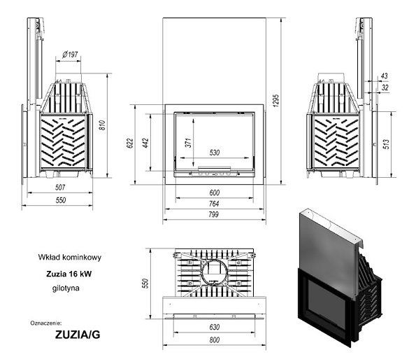 Каминная вставка Zuzia/G имеет гильотинный механизм открытия дверцы. Благодаря чугунным внутренним вставкам и толстым стенкам корпуса из котловой стали, топка имеет долгий срок эксплуатации. Температура газов на выходе из топки порядка 300°С. Ее мощности достаточно для отопления дома в 120-160 м2.