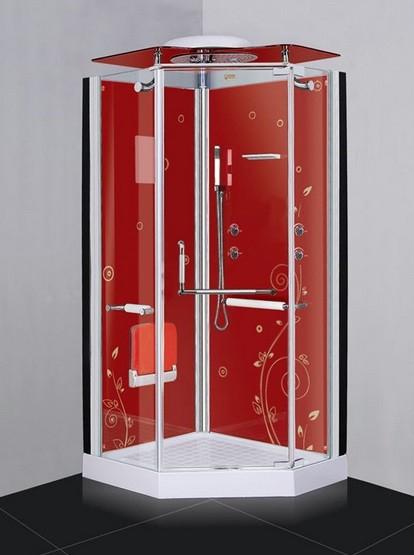 Красный цвет смотрится эффектно и необычно в любом интерьере. Добавляют удобства простые раздвижные двери, а внутри кабины – есть сидение, небольшое зеркало и полочки для душевых принадлежностей. Функционал включает в себя гидромассаж и верхний тропический душ.