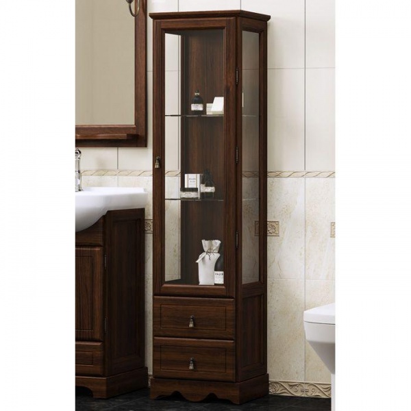 Напольный пенал Клио 40 из массива бука цвета антикварный орех. Модель оснащена 2-мя ящиками, дверцей с прозрачной витриной и бронзовой фурнитурой.