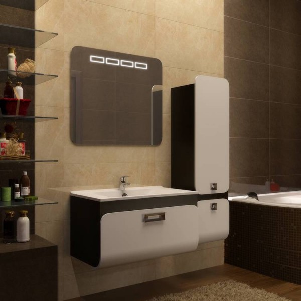 Предусмотрено также наличие зеркала с оригинальной встроенной подсветкой. Корпус изделия изготовлен из натуральных древесных материалов с влагостойким покрытием для долговечности службы. Если позволяет свободное место в ванной комнате, то дополнительно вы можете приобрести подвесной пенал.