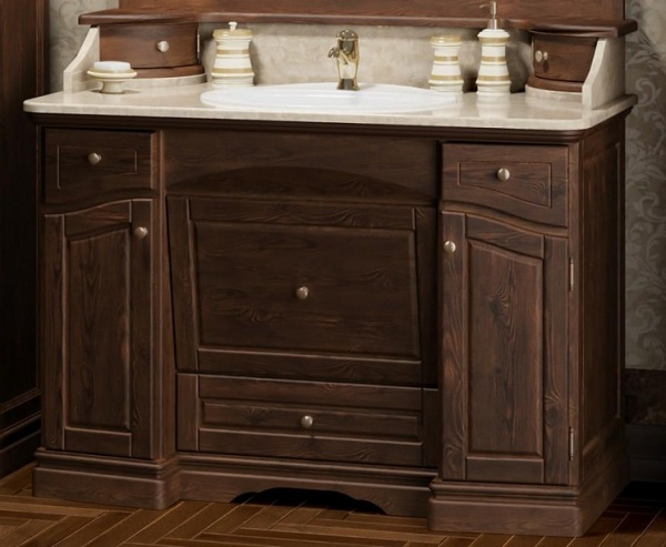 Набор изготовлен из массива бука в цвете орех антикварный, что смотрится великолепно в любых классических интерьерах. В него входит зеркало в раме с подсветкой, тумба с умывальником и удобными отделениями для хранения вещей.