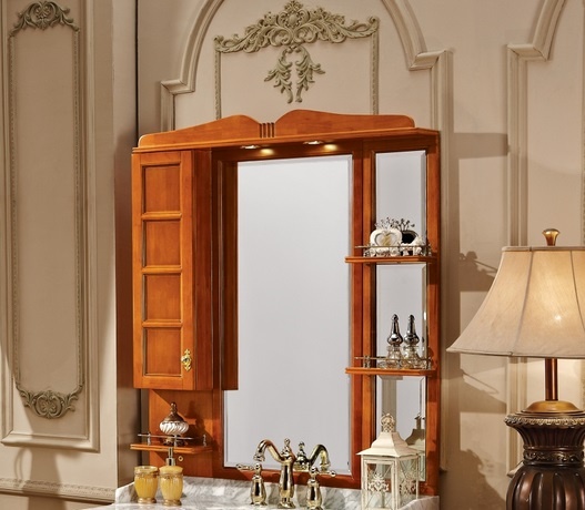 Все необходимое теперь будет под рукой, потому что в шкафчике и на открытых полочках достаточно места для косметики и всевозможных гигиенических средств. Дополнительная подсветка пригодится в темное время суток. Лучше всего данное зеркало гармонирует с тумбой из этой же коллекции.