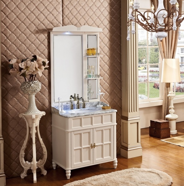 Данная модель выполнена в классическом дизайне, предусматривая наличие полочек и выдвижных ящиков. Есть также керамическая раковина – это немаловажно для удобства личной гигиены. А столешница просто роскошная, так как выполнена из 100% натурального мрамора.