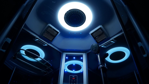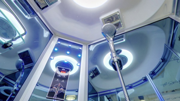 Кабина имеет угловую форму с низким поддоном из акрила. Внутри предусмотрено сидение, зеркало, дозатор и полочки для ежедневных средств по уходу за собой. Радует наличие гидромассажа, тропического душа и красивой подсветки.