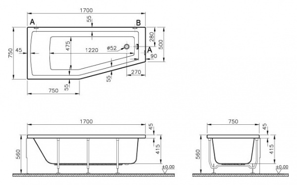 Асимметричная акриловая ванна Vitra Neon 170x75/50 L/R - Характеристики