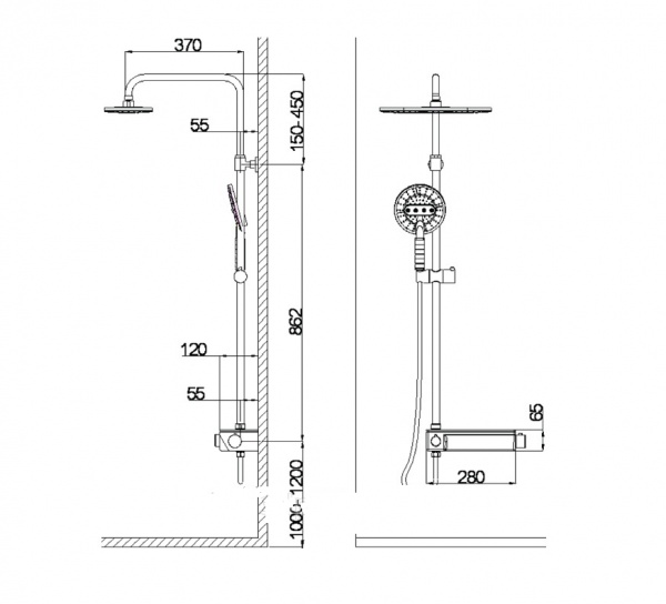 | Головной душ регулируется по высоте за счет удлинения стойки 55 см +/- 20 см. | |